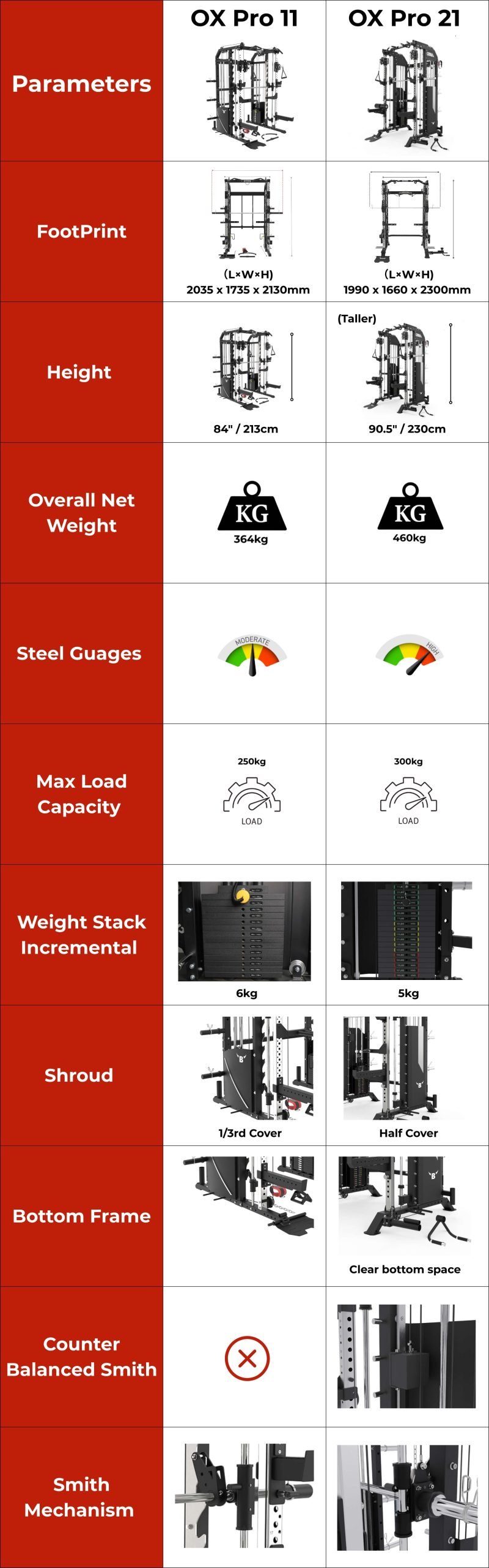 Compared to the OX Pro 11, the OX Pro 21 features a taller, heavier frame, a counterbalanced Smith machine, and premium materials, mechanisms, and accessories for a superior workout experience.