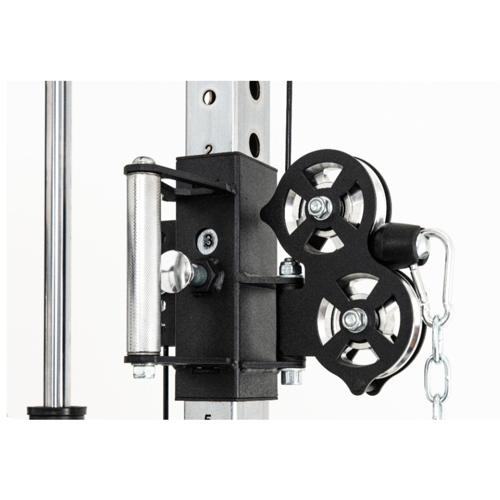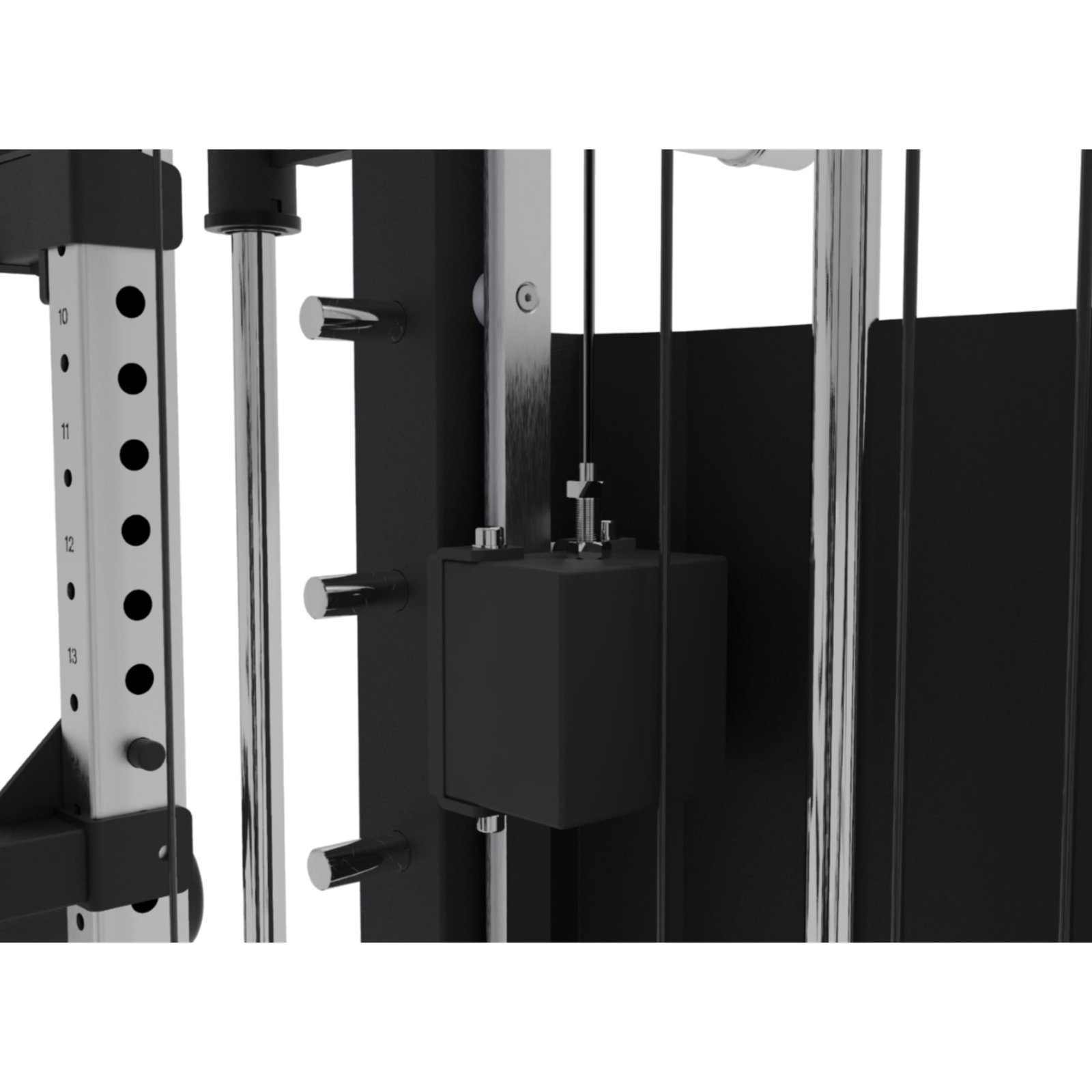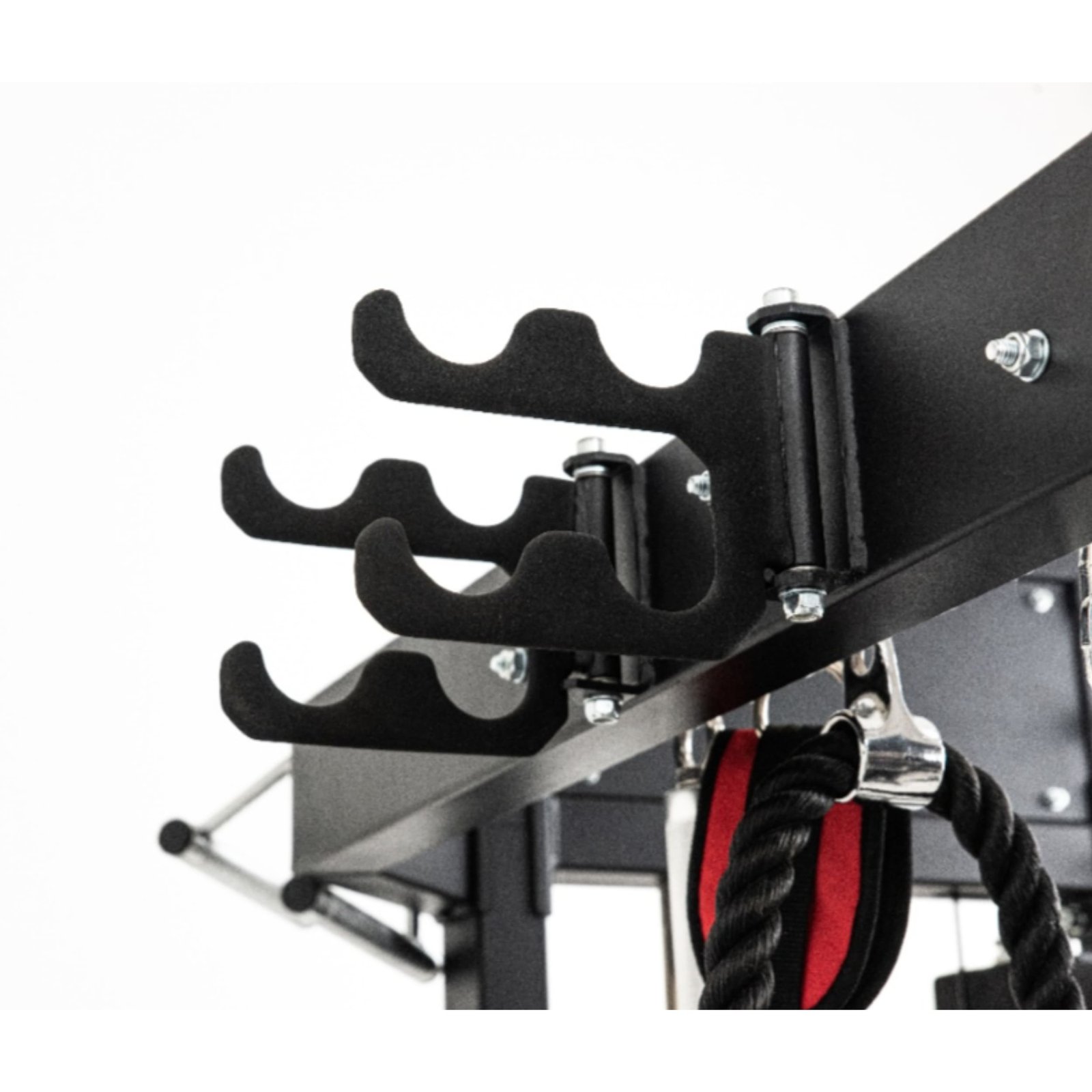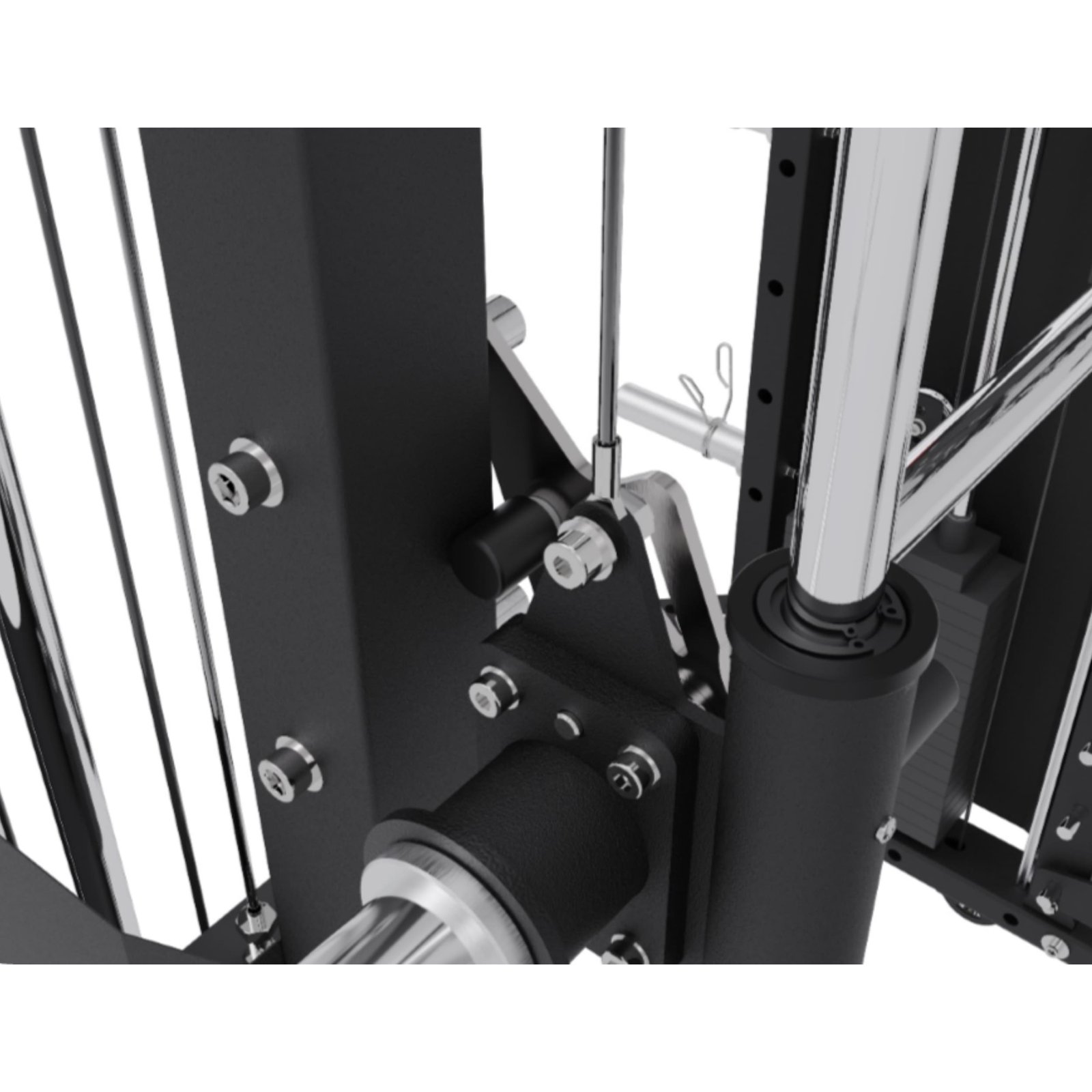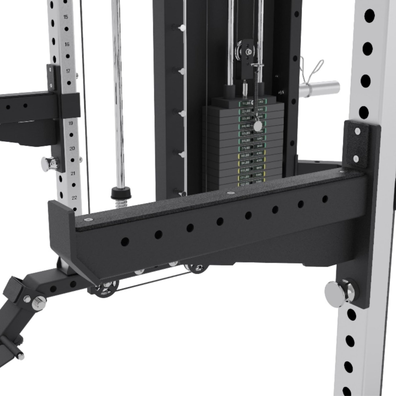 - Integrated Adjustable Thigh Roller mounts on spotter arms, adding stability for lat pull-downs, Nordic curls, and split squats.