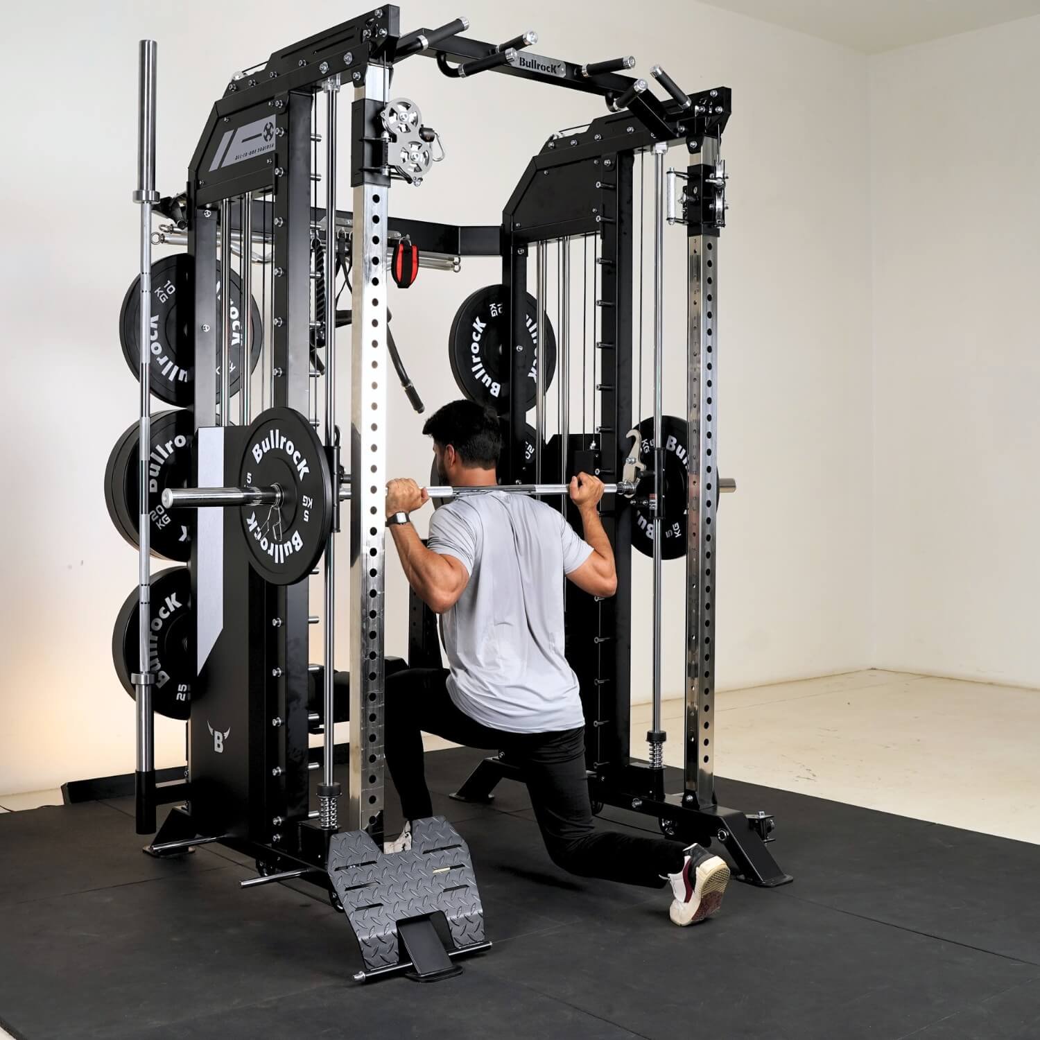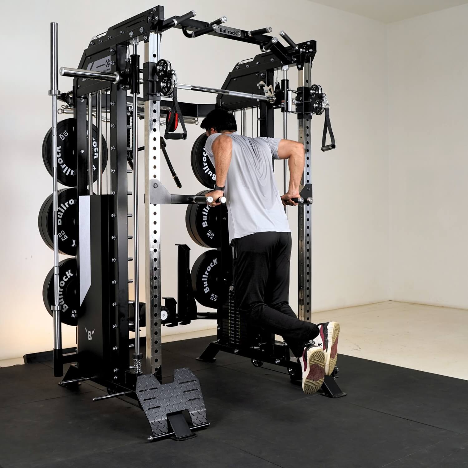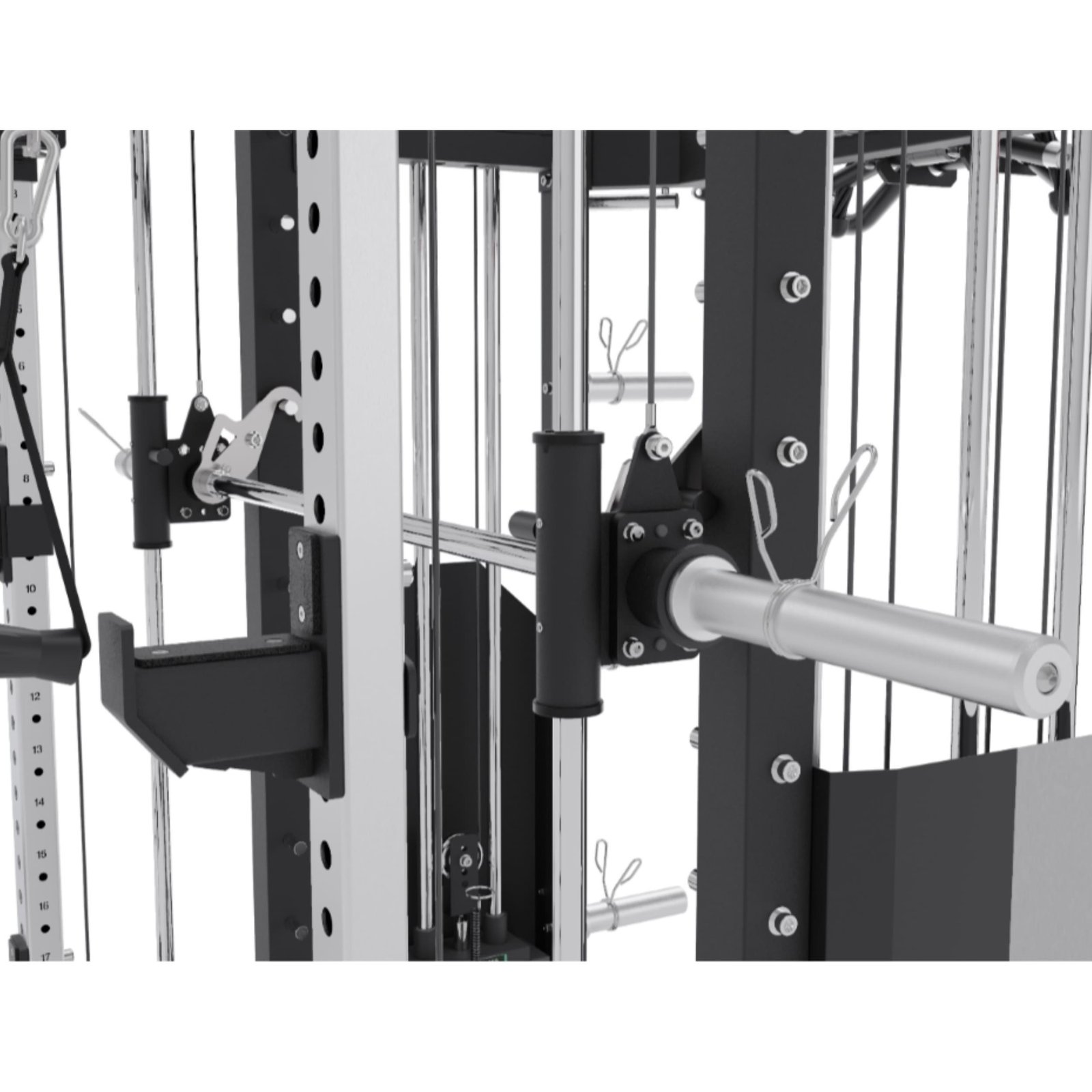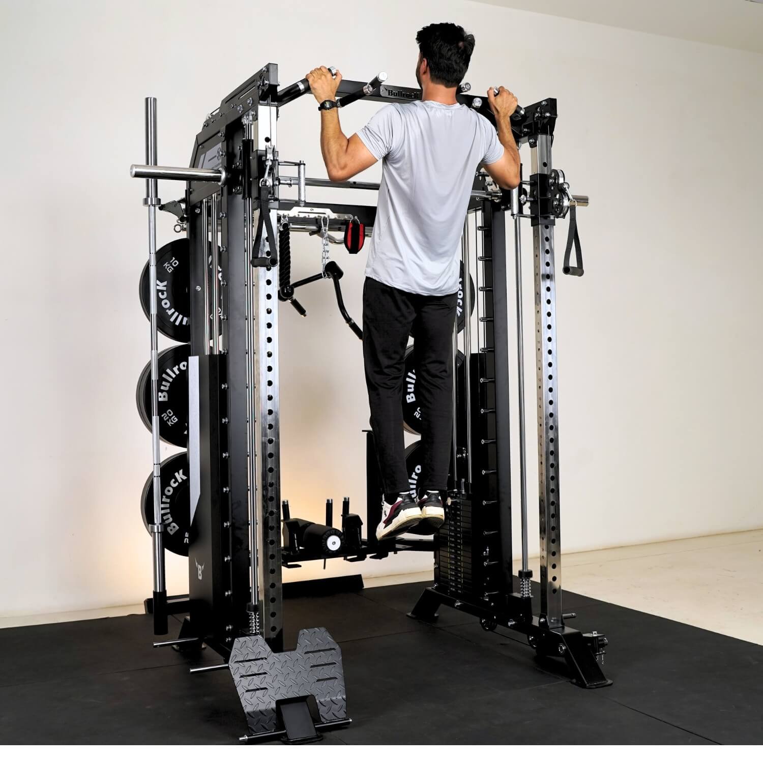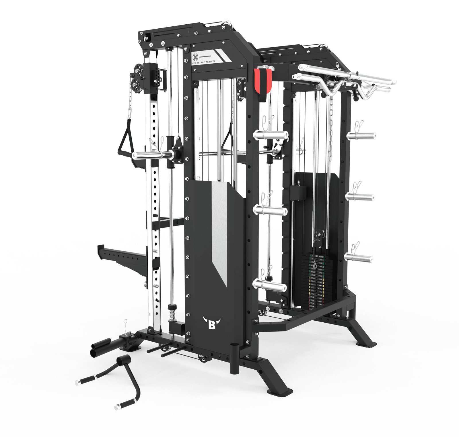 It integrates a Squat Rack, Functional Trainer, Smith Machine, Adjustable Dip Station, Low Row, Multi-Grip Pull-up Bar, and T-Bar Landmine—all in one compact unit. With optional attachments, you can expand your workout options without increasing space.