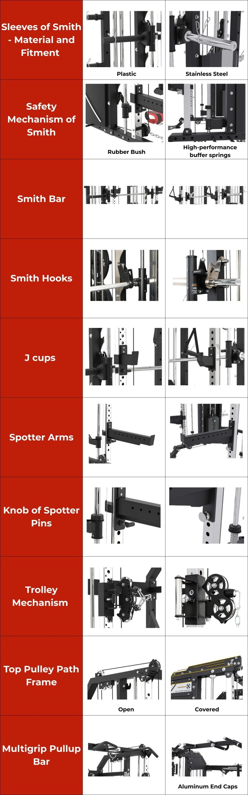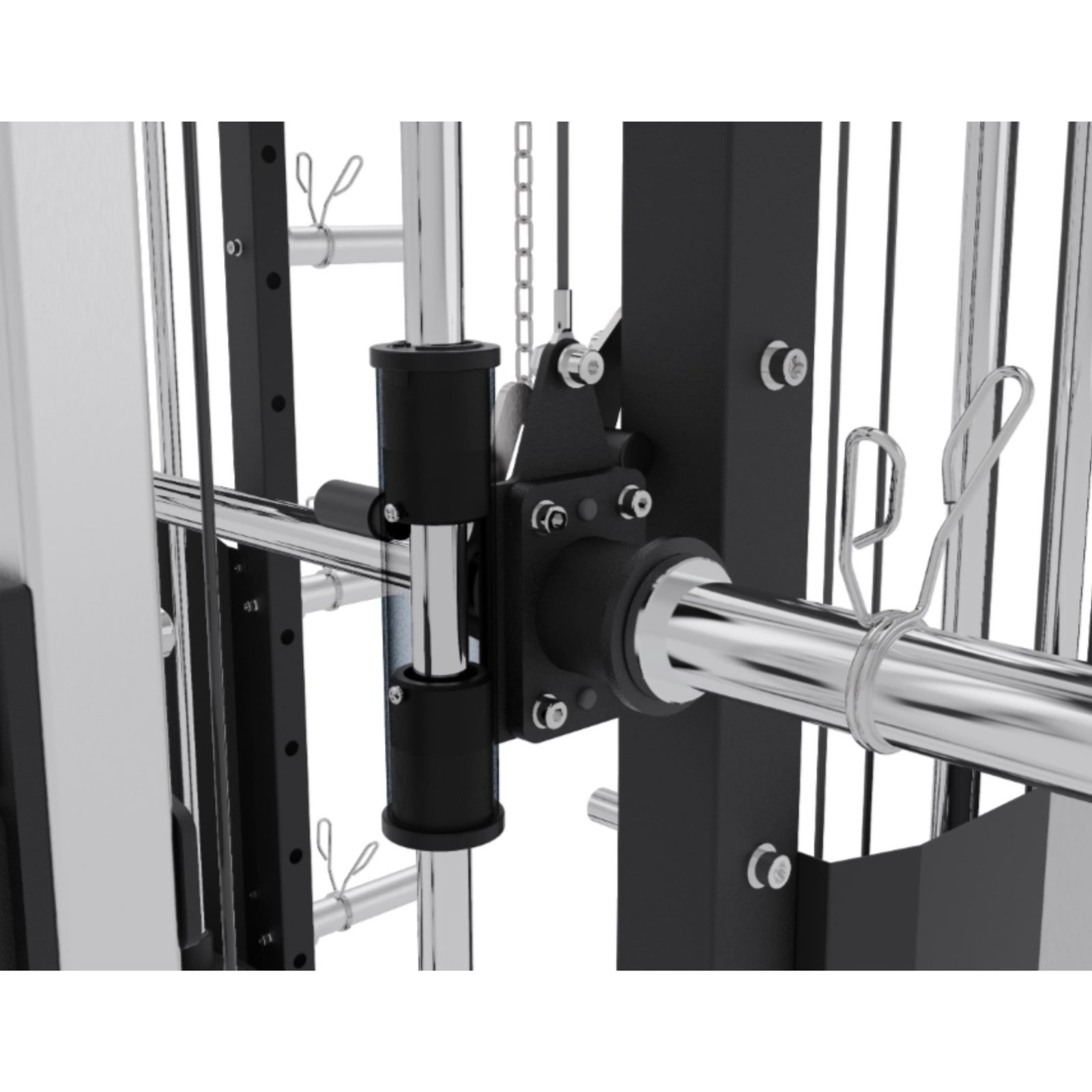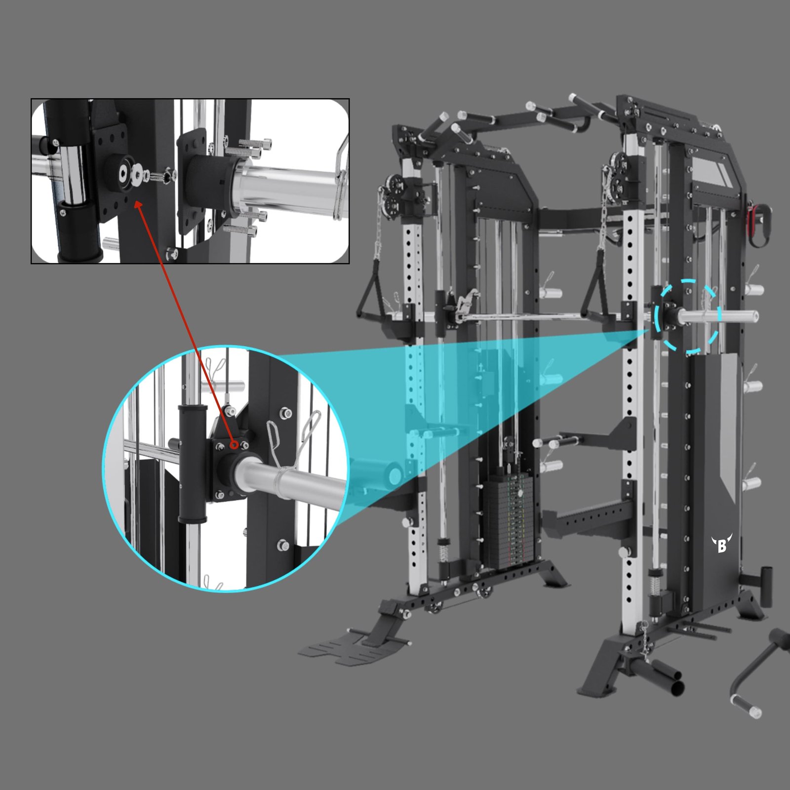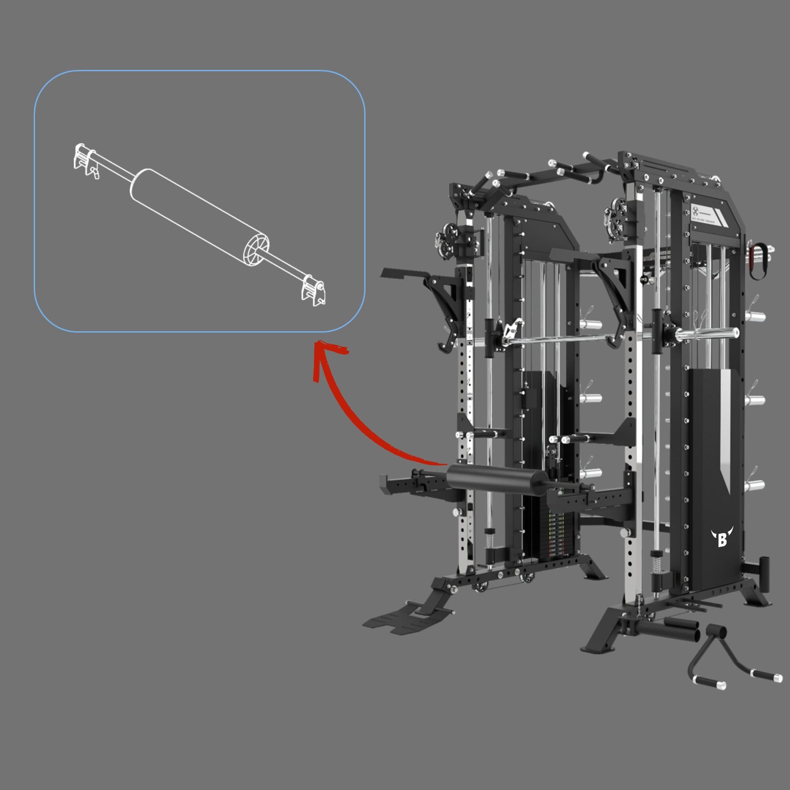 - Shockbrace protects the Smith Machine’s upper bearing with rubber and buffer springs, absorbing impacts for safer workouts.