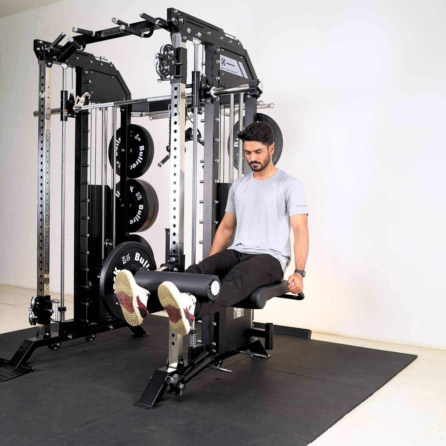 - Smith machine with built-in mute linear bearings for smooth and quiet experience.