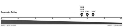 Weight (kg) Thickness Shore Durometer 25 84mm 88 20 72mm 88 15 58mm 88 10 38mm 90 5 23mm 92