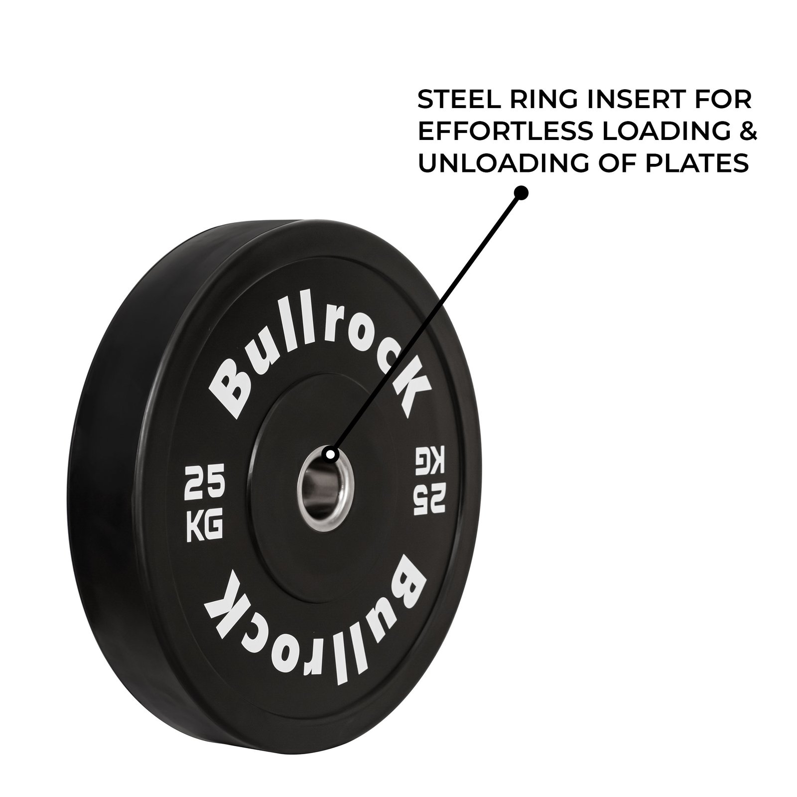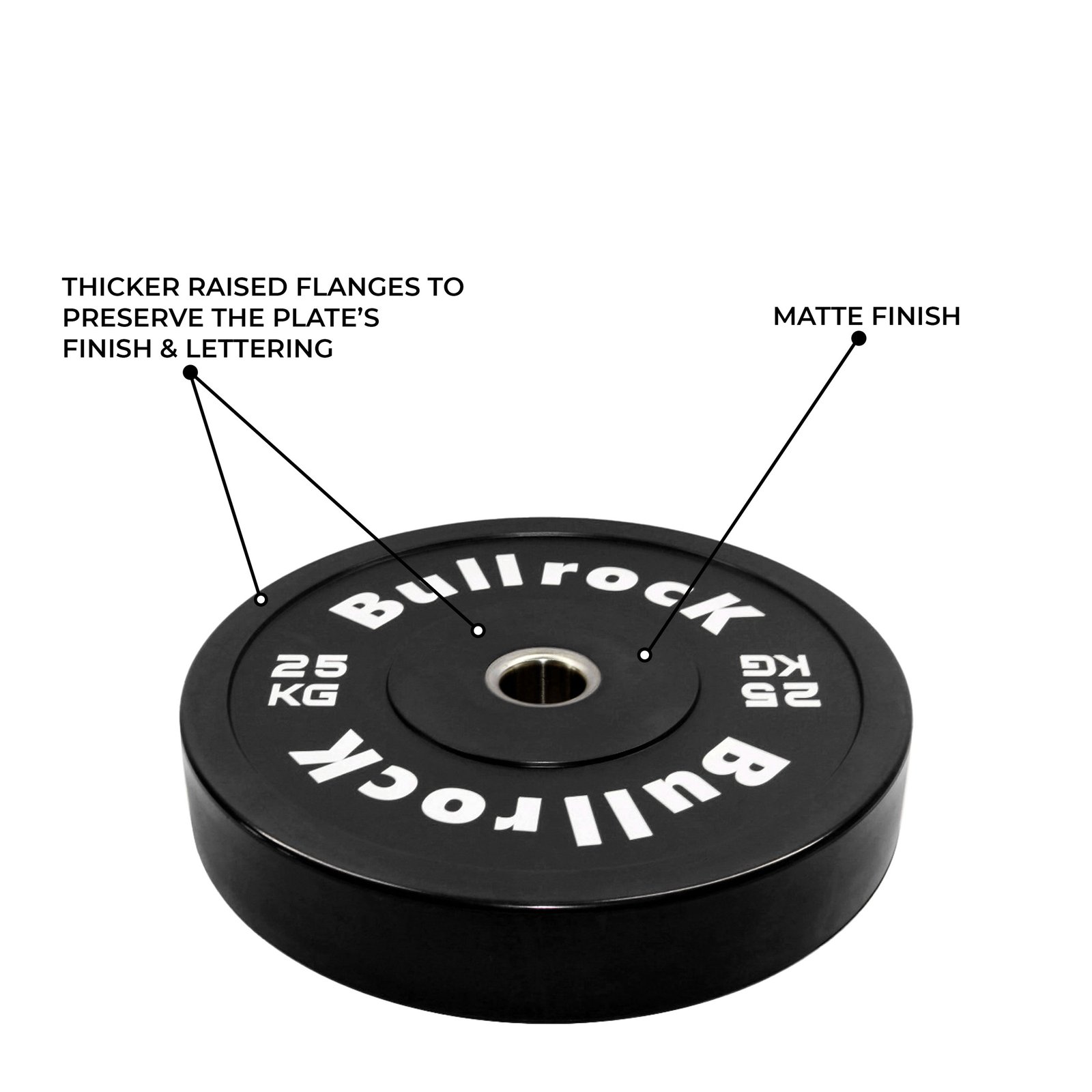 The BullrocK Black Bumper Plates 2.0 are the upgraded version featuring 3D raised lettering, an improved matte finish, a thinner plate profile, and thicker raised flanges. Crafted from high-quality natural rubber, these plates offer low bounce and superior impact absorption.
