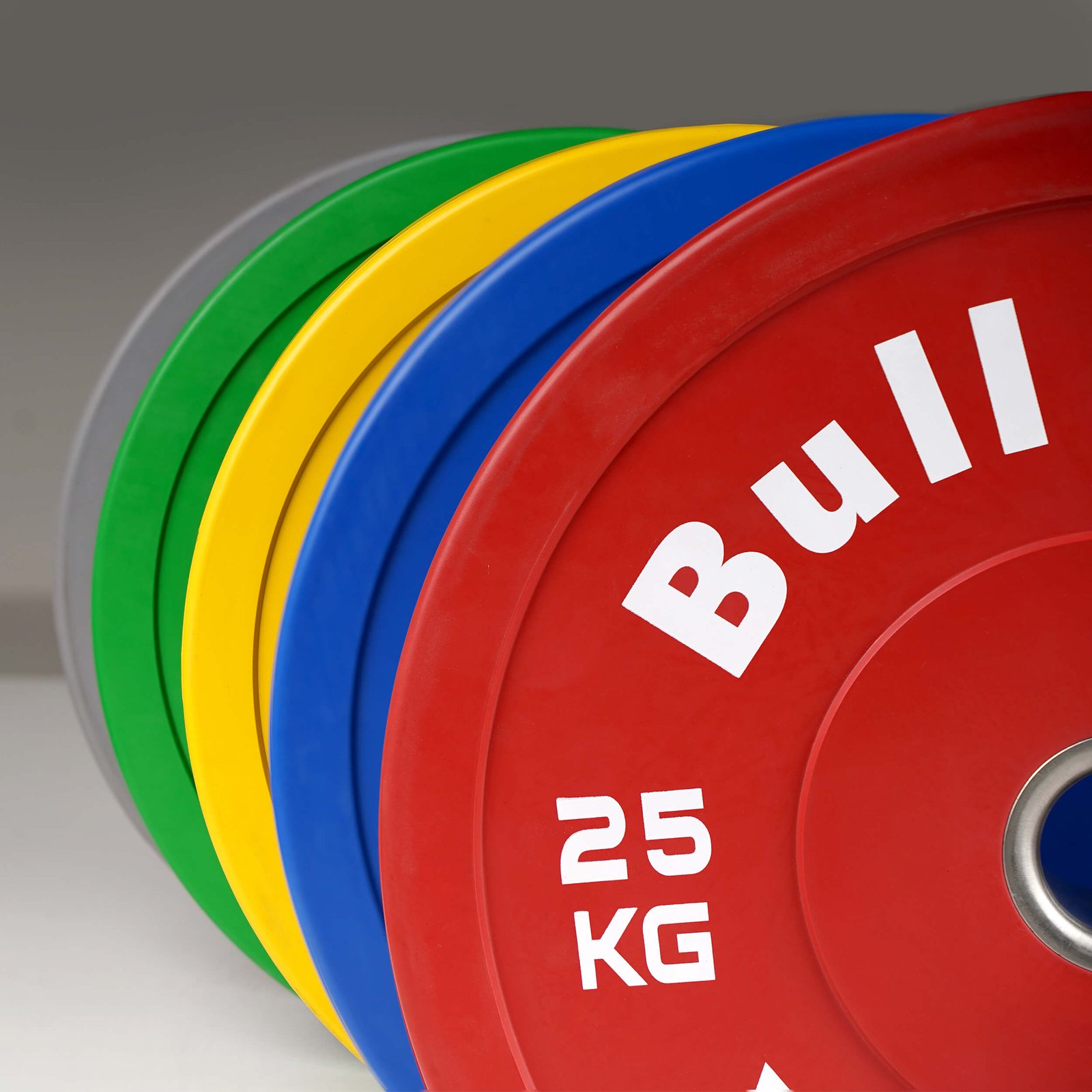 Color Weight (kg) Thickness Shore Durometer Red 25 84mm 88 Blue 20 72mm 88 Yellow 15 58mm 88 Green 10 38mm 90 Gray 5 23mm 92