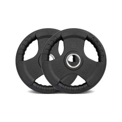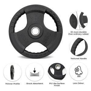 The Plates feature a classic 3 cut design making it easy to load and unload onto bars and plate loaded machines. It has a textured grip on the 3 cut handles making it extremely convenient for grasping and overall handling. The design along with a PU like surface finish makes it aesthetically better.