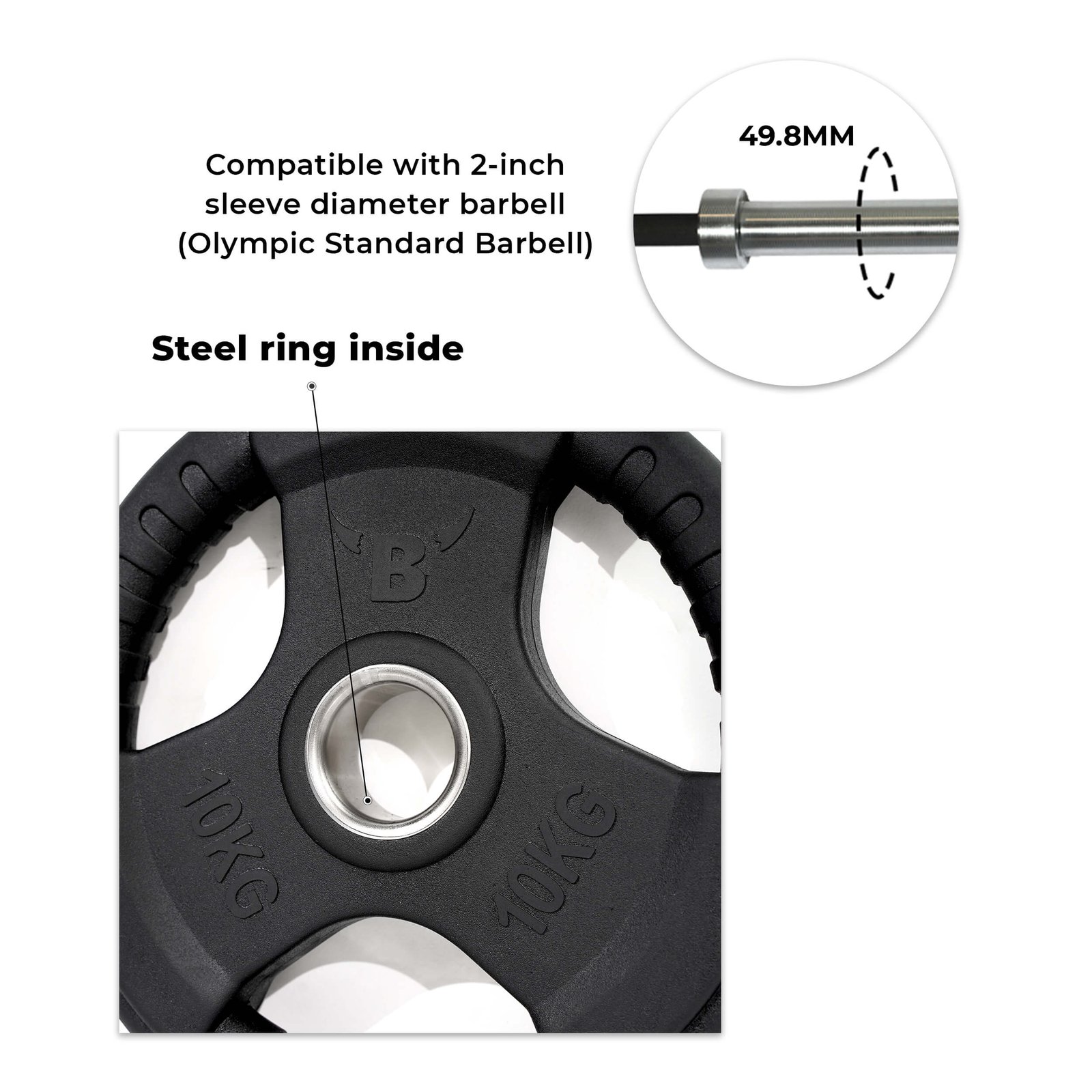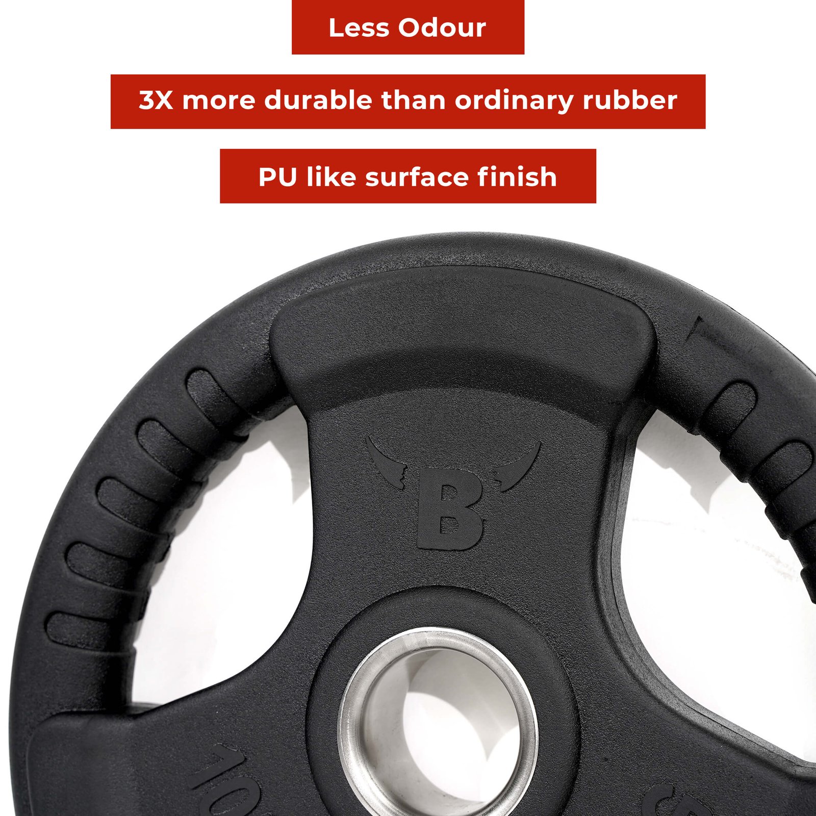 The acronym for durable, Dura rubber Plates are made to be true to its name and are your durable lifting companion. What separates it from regular rubber plates is, the 3 times more durability than ordinary rubber plates and PU like surface finish achieved by a better chemical composition and processing. This rubber doesnt crack and fall out in comparison to regular ones, making it more durable. This also reduces the odour that comes with regular rubber.