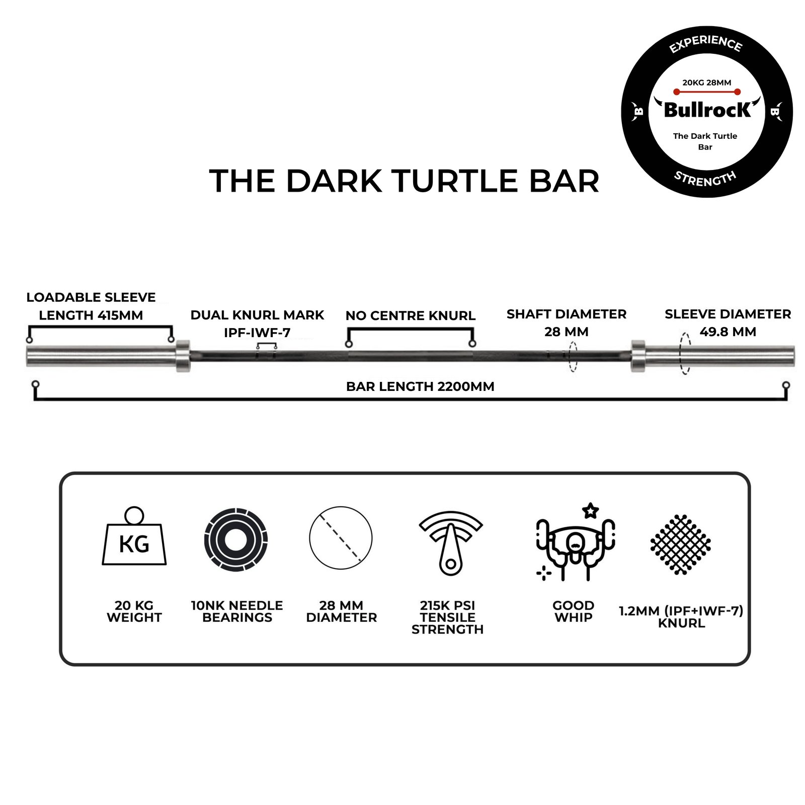 The BullrocK Dark Turtle Bar offers performance identical to the Red Turtle Bar, with the same 28mm shaft diameter, tensile strength, and premium 8 NK Needle Bearing system (4 per sleeve) that delivers consistent sleeve rotation and Olympic-level lifting performance. Its mechanical specifications, whip, and load capacity remain unchanged – making it an equally capable choice for serious athletes and weightlifting gyms.