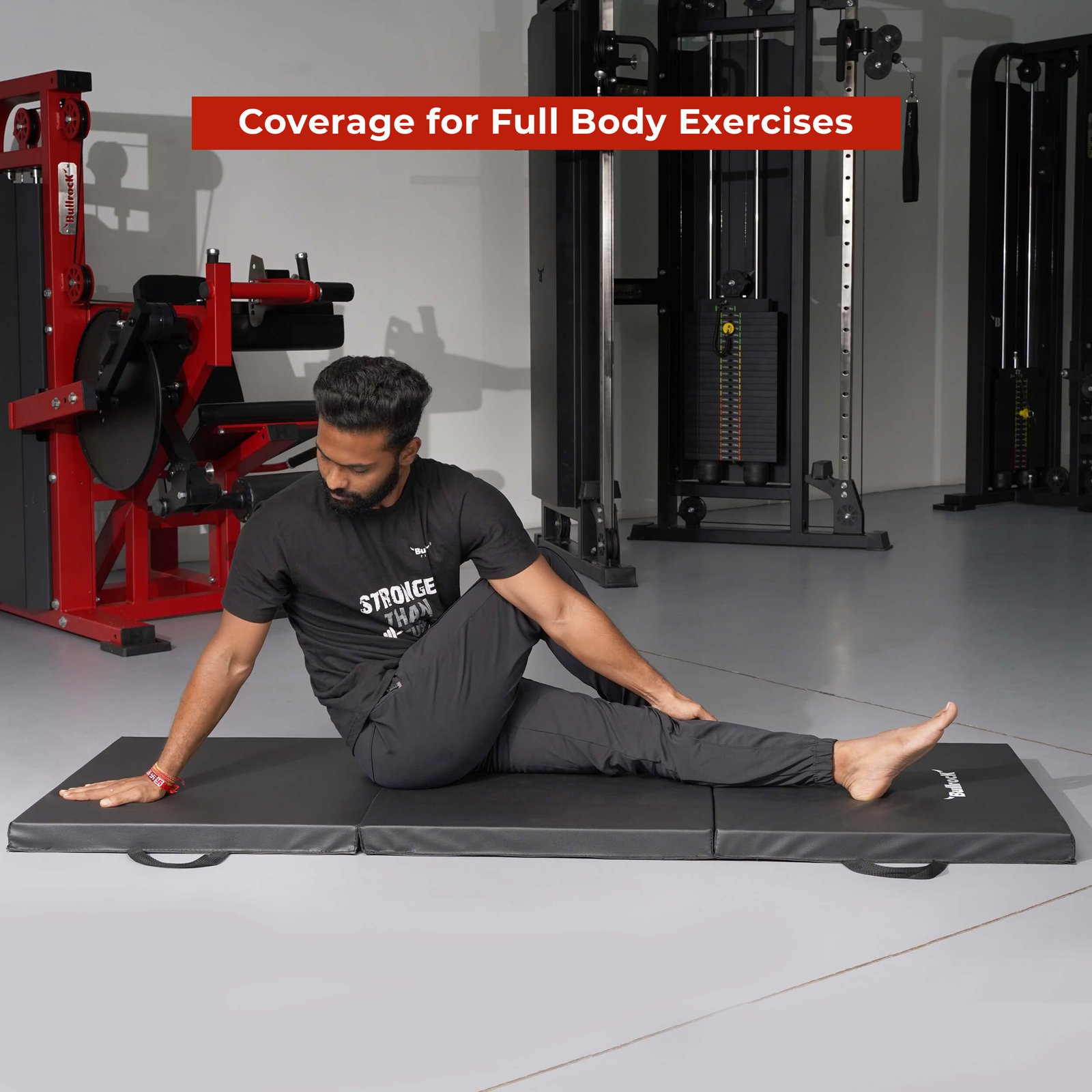 Experience the convenience and comfort with our Tri-Fold Exercise Mat. The three fold design, makes it easy to store. When folded, it transforms into a compact, case-like shape with convenient handle straps, allowing you to carry it effortlessly and save space in your commercial gym by stacking multiple mats in a compact space.